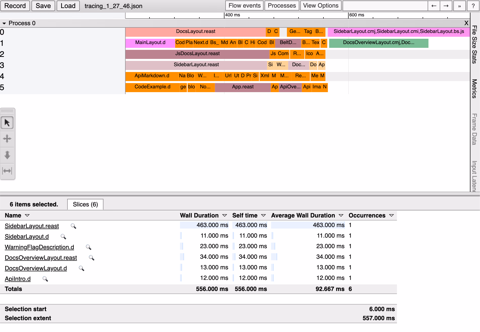 Run the above command at your ReScript project's root; it'll spit out a JSON file you can drag and drop into chrome://tracing.
